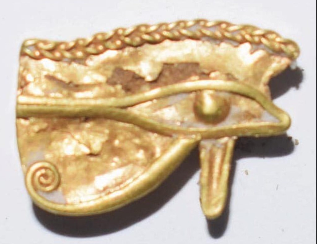 En Tell El Fara’in también se encontró un símbolo de oro puro del ojo de Ra. Alternativamente conocido como ‘ojo de wedjat’ u ‘Ojo de Horus’, se consideraba un talismán que otorgaba salud y protección al propietario.
