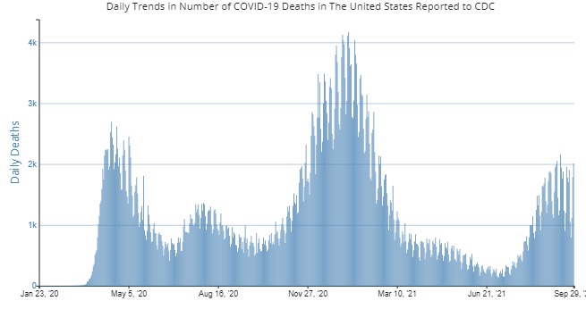 La cuarta ola de la pandemia de COVID-19 en los Estados Unidos parece ser casi el doble de mortal que la segunda ola, que ocurrió meses antes de que cientos de millones de personas recibieran vacunas contra el coronavirus. Según datos de los CDC, las tasas de mortalidad por coronavirus en los Estados Unidos en los primeros diez días de septiembre de 2021 fueron casi el doble que durante los primeros diez días de septiembre de 2020, informó National File. La tendencia parece seguir siendo constante a medida que nos acercamos a principios de octubre.