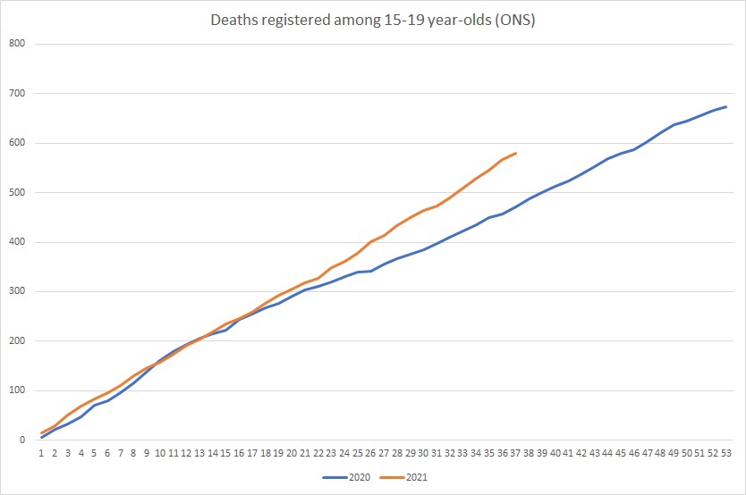 Investigué un poco los datos y debo decir que estoy de acuerdo en que parece preocupante. He representado por encima de las muertes entre los jóvenes de 15 a 19 años por semana para 2020 y 2021 (Lamentablemente, los datos equivalentes no están disponibles para años anteriores, ya que antes de 2020 el desglose estaba en 1 a 14 y 15 a 44 años). viejos.)
