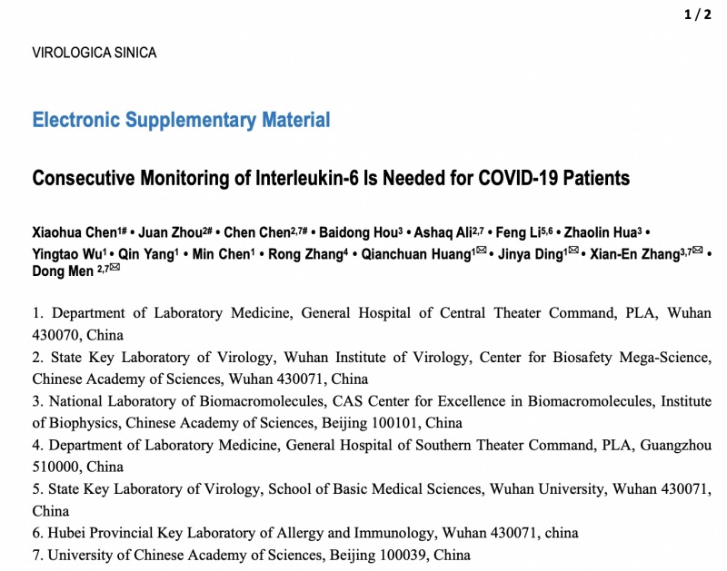 Los estudios publicados en Virologica Sinica, incluidos los centrados en COVID-19, también cuentan con investigadores del Instituto de Virología de Wuhan junto con investigadores del Comando del Hospital General de Teatro Central y Sur del PLA como autores.