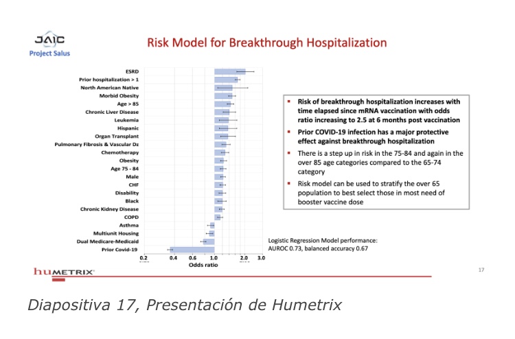 La diapositiva 13 documenta que la efectividad de la vacuna contra la hospitalización innovadora disminuye considerablemente después de cinco o seis meses en comparación con los meses tres y cuatro. La diapositiva 16, que no incluye a las personas no vacunadas en las estimaciones, describe los datos que muestran que la efectividad de la vacuna de ARNm no cumple con las predicciones del estudio, pero propone que la vacuna ofrece un mayor nivel de protección contra la hospitalización que por contraer la infección.