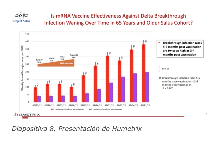En la diapositiva 8 de la presentación de diapositivas 17, titulada «¿La eficacia de la vacuna de ARNm contra la infección innovadora de Delta está menguando con el tiempo en la cohorte de Salus de 65 años?»la información muestra una disminución significativa de la eficacia de la vacuna en un corto lapso de 3 a 4 meses. La diapositiva dice: «Las tasas de infección de ruptura 5-6 meses después de la vacunación son dos veces más altas que 3-4 meses después de la vacunación». Estos datos ponen en tela de juicio la efectividad general de las vacunas y el llamado de refuerzos de la administración Biden cada tres o cuatro meses. La diapositiva 10 concluye que «La edad tiene una contribución menor a la reducción de la protección de la vacuna observada en el grupo vacunado hace 5-6 meses».