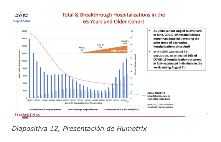 En la Diapositiva 11, el equipo del estudio reconoce la disminución específica de la inmunidad a la vacuna, señalando que la protección de Moderna supera a la de Pfizer. En la Diapositiva 12, que muestra datos etiquetados como «Casos totales y revolucionarios en la cohorte Salus de 65 años y mayores», el estudio proporciona un gráfico que indica el número de casos de COVID-19 durante los seis meses comprendidos entre el 6 de febrero y el 21 de agosto de 2021. A medida que aumentan los casos de Delta, los datos del estudio revelan que en agosto, el 71% de todos los casos de COVID-19 estaban en individuos vacunados.