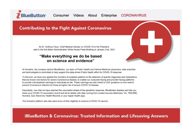 «La Plataforma Humetrix ahora está configurada para la seguridad de la vacuna COVID-19 y el monitoreo de la eficacia en la población de Medicare objetivo de ser vacunada con prioridad. (consulte esta publicación preliminar de MedRxiv y este artículo de JAMA para obtener más información)».
