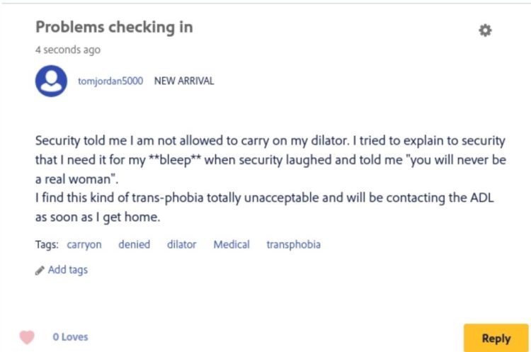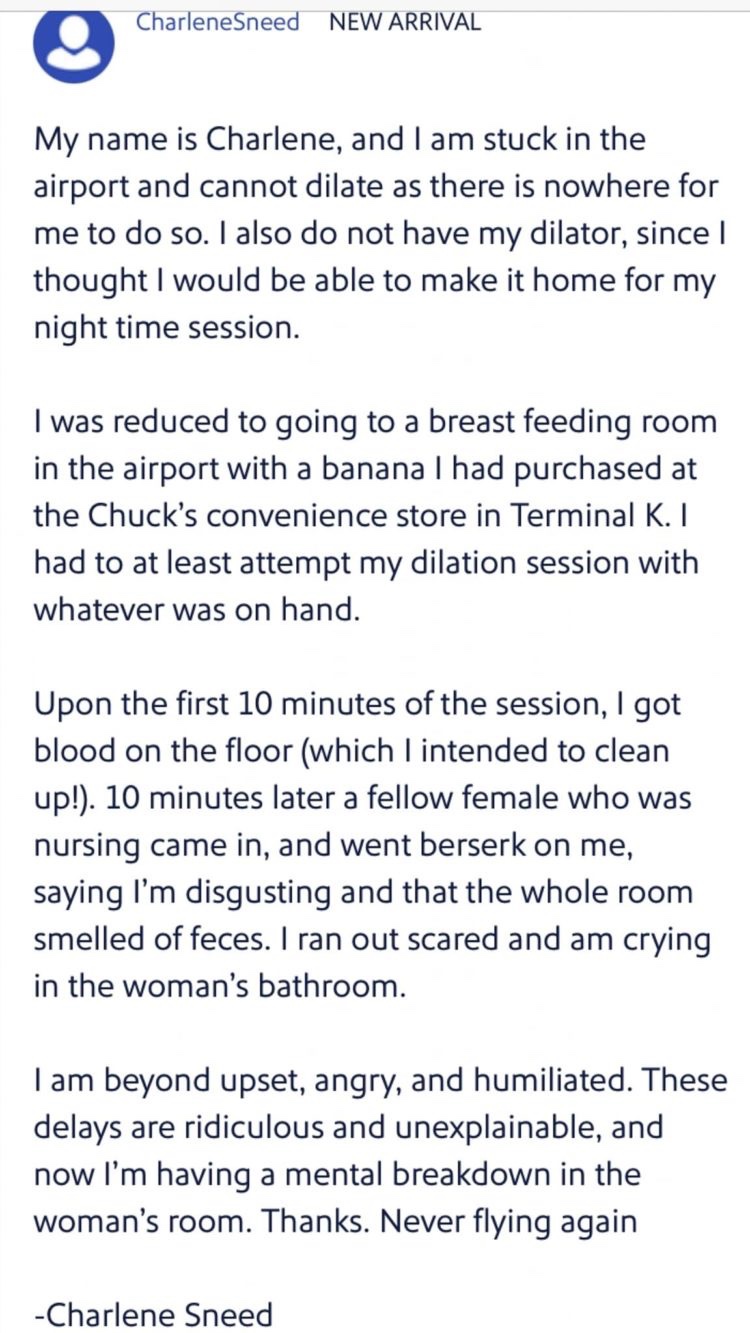 «He estado hablando por teléfono toda la noche con varias mujeres trans, que se han quedado varadas en el aeropuerto debido a que SU personal racista sale, preocupado de que no puedan dilatar adecuadamente», escribió otro usuario llamado BigBarb. «¿Cómo vas a rectificar esta situación? Estas HERMOSAS y VALIENTES mujeres necesitan estaciones de dilatación adecuadas. ¡¡¡HAZLO MEJOR