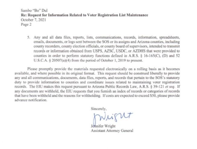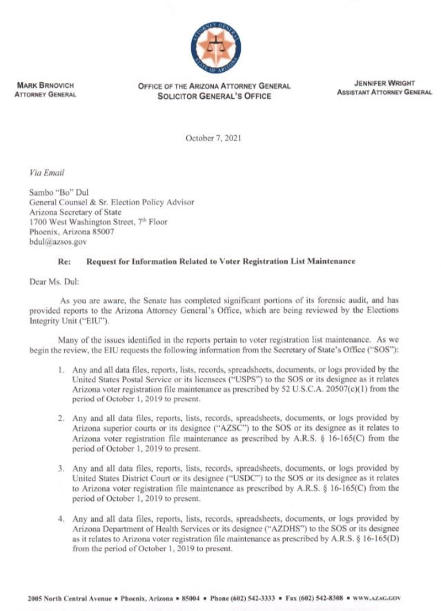 El lunes Jennifer Wright, la Fiscal General Adjunta de Arizona, despidió una carta a la oficina del Secretario de Estado de Arizona solicitando información relacionada con el mantenimiento de la lista de registro en el Estado de Arizona.
