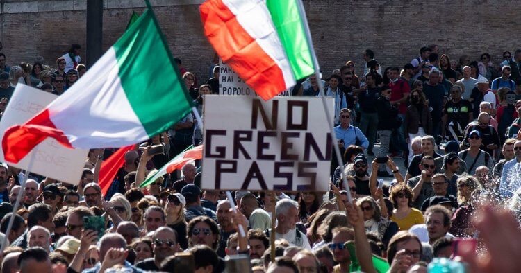 Miles de manifestantes se reunieron el sábado y marcharon por la famosa Vía Véneto de Roma, «enfingiendo con la policía mientras protestaban por el nuevo requisito de vacunación ‘Green Pass’ de Italia para que los empleados ingresen a sus oficinas», informó The Associated Press.