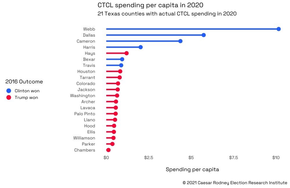 De las 26 subvenciones que CTCL otorgó a ciudades y condados de Arizona, Georgia, Michigan, Carolina del Norte, Pensilvania, Texas y Virginia que fueron de 1 millón de dólares o más, 25 fueron a áreas que Biden ganó en 2020. El único condado de esta lista ganado por Donald Trump (Condado de Brown, Wisconsin) recibió alrededor de 1,1 millones de dólares, menos del 1,3 por ciento de los 85,5 millones de dólares que CTCL proporcionó a estos 26 principales beneficiarios.