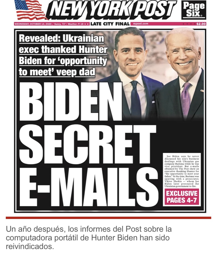 Un medio, Politico, ahora finalmente admite que teníamos los productos porque su propio reportero, Ben Schreckinger, recibió una confirmación «independiente» de algunos de los correos electrónicos. Sin embargo, casi un año después de que ya hubiera sido confirmado por personas como Bobulinski, The New York Times todavía llamó a nuestros informes «infundados», aunque horas más tarde, eliminó silenciosamente esa palabra de su historia.