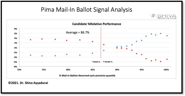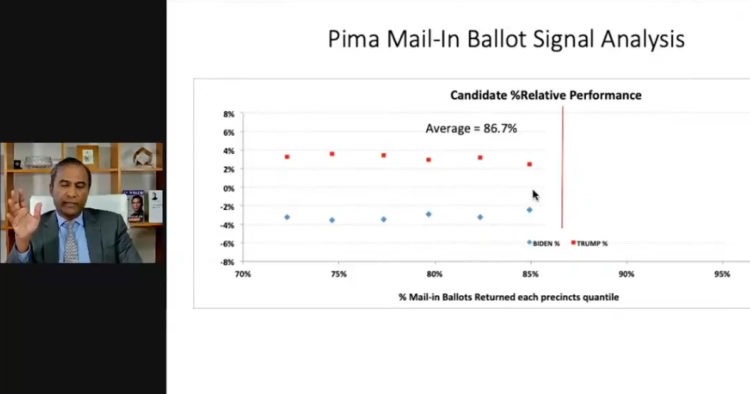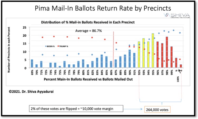 El presidente Trump luego enumeró una serie de comisarías que tenían tasas poco realistas de devolución de papeletas por correo en comparación con el resto del país. «La tasa nacional de devolución de la boleta por correo fue del 71 %», escribió el presidente Trump. Sin embargo, 42 distritos del condado de Pima tuvieron más del 97% de las papeletas por correo devueltas, y dos tuvieron más papeletas devueltas de las enviadas. «Otro distrito con participación del 100,6% tuvo 2.182 papeletas devueltas, pero solo se enviaron 2.170 correos», escribió el presidente Trump. «Estos dos suman 11.994 papeletas, solo más del margen necesario para ganar».