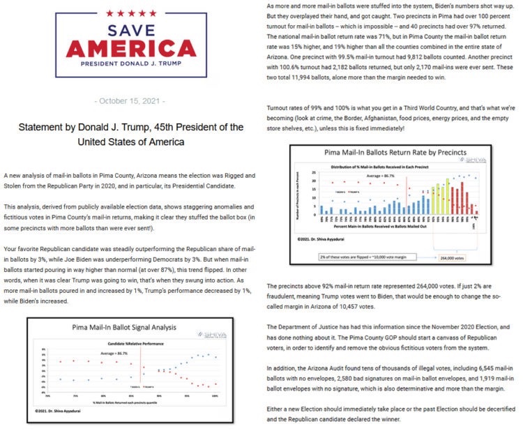 Hoy el 45o presidente Donald Trump emitió una declaración que revela nuevos hallazgos del Dr. Shiva Ayyadurai con respecto a las elecciones de 2020 en el condado de Pima, Arizona.