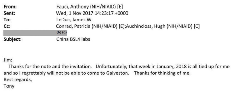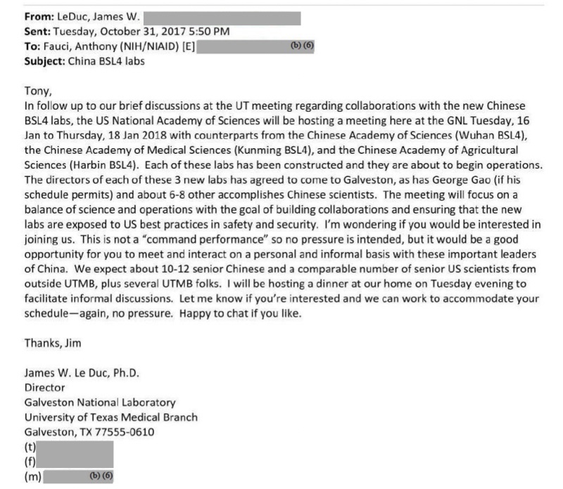 LeDuc envió un correo electrónico [abajo] a Fauci el 31 de octubre de 2017 titulado «China BSL4 labs» donde recuerda a Fauci cómo conversaron «con respecto a las colaboraciones con los nuevos laboratorios chinos [de bioseguridad nivel 4]». Entre los laboratorios a los que hace referencia LeDuc se encuentra la «Academia China de Ciencias (Wuhan BSL4).»