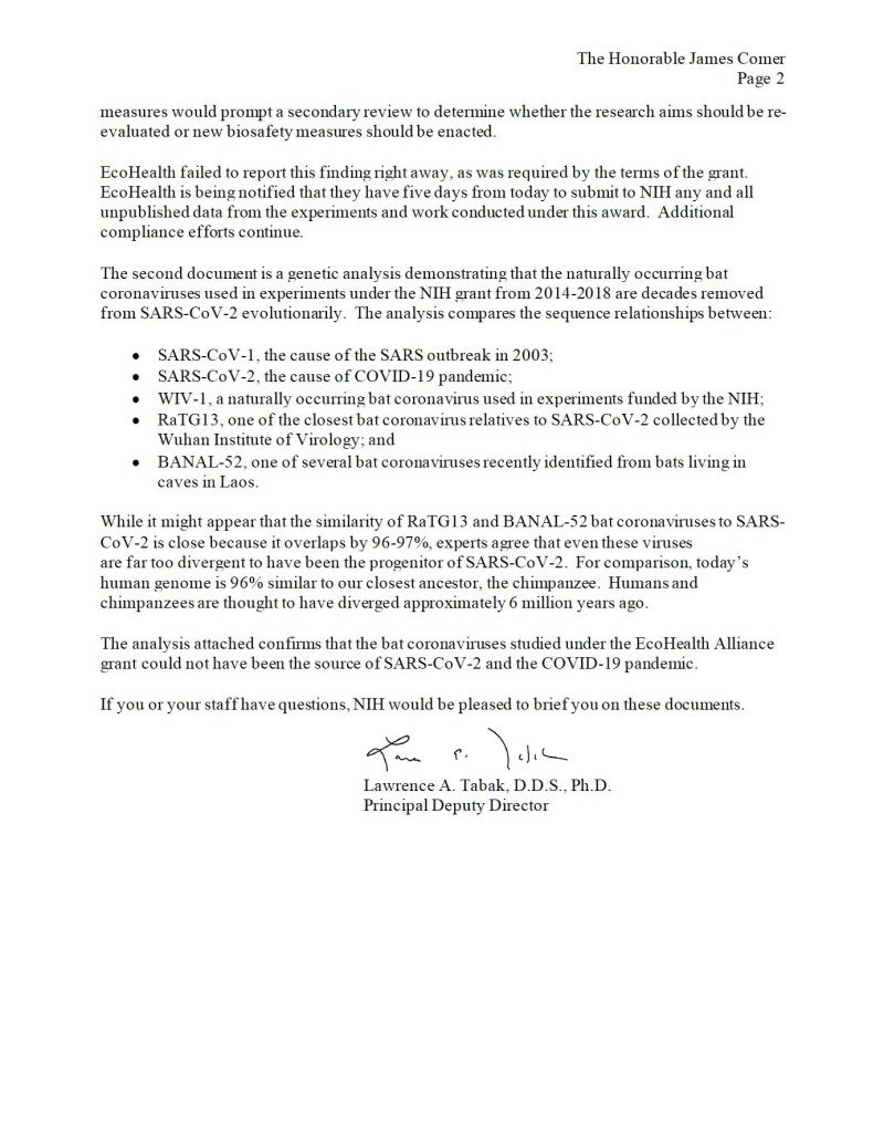 La admisión llega en una carta del Director Adjunto Principal de los Institutos Nacionales de Salud, el Dr. Lawrence Tabak, en respuesta a las preguntas del congresista James Comer sobre una controvertida subvención multimillonaria del Instituto Nacional de Alergias y Enfermedades Infecciosas (NIAID) de Fauci a la Alianza de Ecosalud de Peter Daszak.