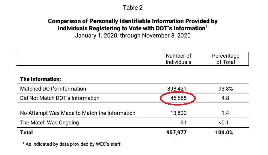 De los que se registraron en 2020, más de 45.000 de la información de estas personas no coincidía con la información del Departamento de Transporte de Wisconsin (DOT) sobre las mismas personas. Otros 13.800 individuos ni siquiera fueron emparejados con datos del DOT. ¡Eso son casi 60.000 casos!
