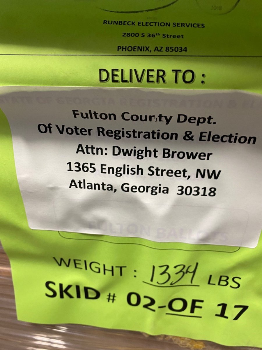 Según Moncla, el condado de Fulton, Georgia ordenó y recibió más de 1 millón de papeletas de Runbeck en los últimos 10 días antes de las elecciones. Las papeletas recibidas fueron papeletas de voto ausentes basadas en el tamaño de las papeletas ordenadas y facturas relacionadas.