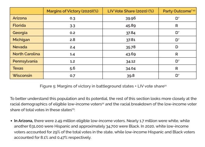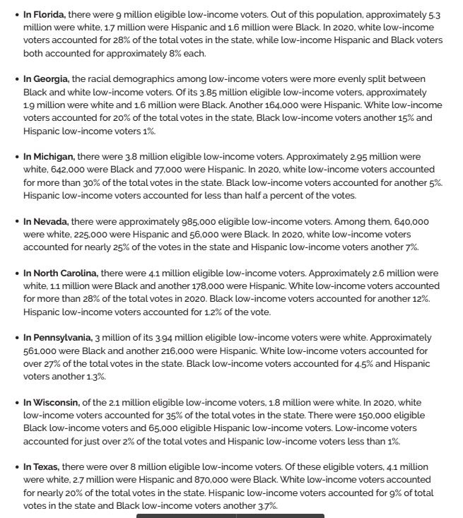 Sin embargo, en los estados del campo de batalla, los votantes de bajos ingresos representaron un porcentaje significativo del total de votos contados.