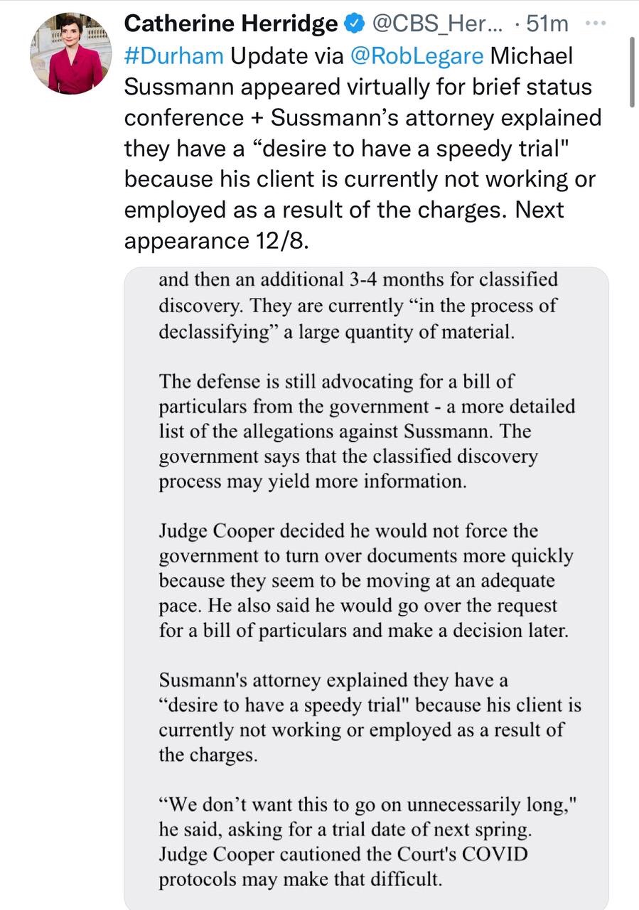 El abogado de Sussmann explicó que tienen un «deseo de tener un juicio rápido» porque su cliente actualmente no está trabajando o empleado como resultado de los cargos. https://t.me/QAnons_Espana