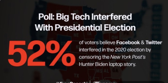 Las reacciones de los estadounidenses a la censura de las redes sociales fueron parte de la encuesta nacional Ómnibus de 1.000 votantes, y los hallazgos hablaron mucho. Cuando se le preguntó «¿Crees que la censura de Facebook, Twitter y otros sitios de redes sociales de la ahora confirmada historia de correo electrónico de Hunter Biden constituye una interferencia electoral?» El 51,8 por ciento respondió: «Sí». Solo el 32,2 por ciento respondió: «No», casi una diferencia del 20 por ciento. Un 15,9 por ciento adicional dijo que no lo sabía.