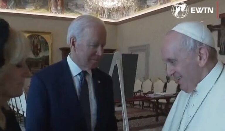 Ahora sabemos por qué el Papa canceló una transmisión en vivo con Biden el jueves. Cuando Joe Biden se reunió con el Papa el viernes, pronunció una línea que es tan incómoda que desafía la creencia. Mira:
