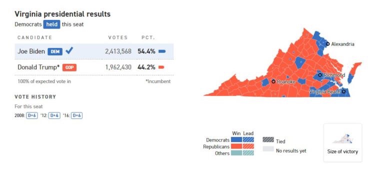 Joe Biden fue galardonado con el Estado Libre Asociado de Virginia en las elecciones de 2020 con un margen reportado de 10 puntos.