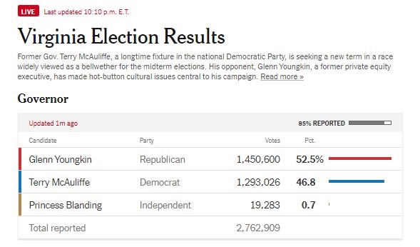 El New York Times actualmente tiene a Youngkin subiendo 9 puntos con un 85% de entrada. Sin embargo, el condado de Fairfax aún no ha informado de todos sus resultados. Anteriormente anunció retrasos y que «rescaneará» las papeletas. McAuliffe tiene un rendimiento inferior al de Biden en el condado en unos 5 puntos, según los primeros resultados.