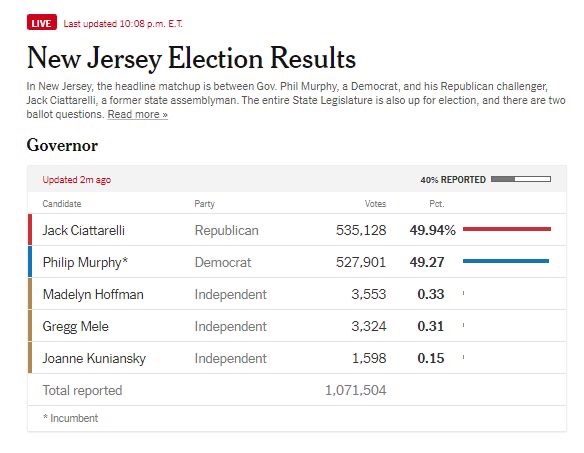 Mientras tanto, la carrera del gobernador de Nueva Jersey está mucho más cerca de lo que los expertos anticiparon. El candidato republicano tiene una ligera ventaja en la carrera por el gobernador de Nueva Jersey, aunque solo hay un 40 % de informes.