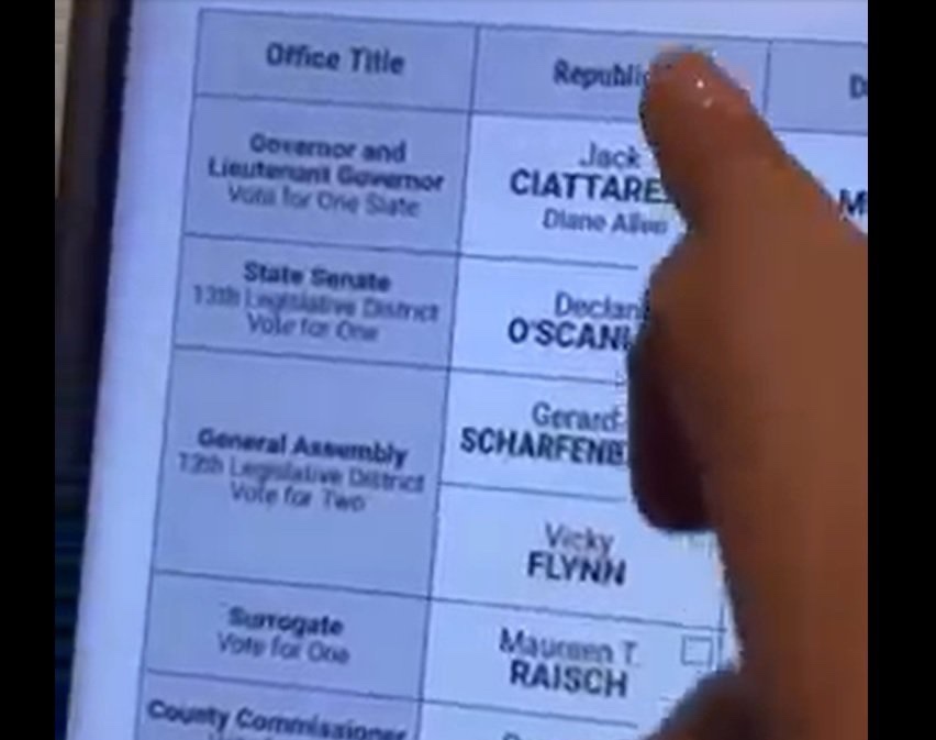 Se están compartiendo dos videos separados en las redes sociales donde el votante en la máquina de votación no puede seleccionar al candidato republicano a gobernador en Nueva Jersey.