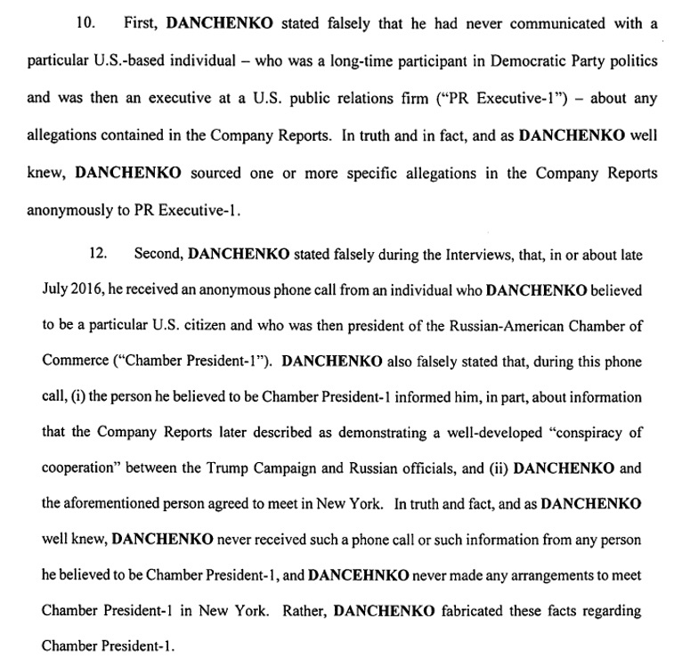 Danchenko negó falsamente más tarde al FBI que el Ejecutivo demócrata de relaciones públicas (Dolan) le hubiera proporcionado información.