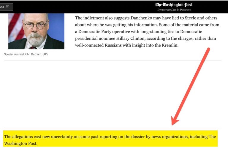 «La última acusación del abogado especial John Durham es un paso importante para desentrañar lo que realmente sucedió en la larga historia de falsas acusaciones de colusión de Rusia contra la campaña presidencial de Trump de 2016», proclamó el Wall Street Journal en un editorial del viernes. «Los hechos en la acusación se suman a la evidencia de que esto fue desde el principio hasta el último un truco sucio de la campaña de Hillary Clinton, y que los medios de comunicación fueron sus crédulos promotores».