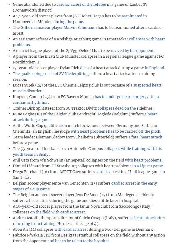 El artículo enumera un gran número de casos recientes de futbolistas que han tenido problemas cardíacos o colapsado en el campo, en algunos casos conduciendo a la muerte.