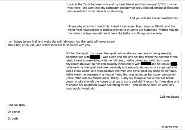 Otros intercambios entre Liz y Hunter el 16 de marzo de 2019 muestran una serie de textos largos y frenéticos donde expresó su frustración con su relación con Hallie y la acusó de «hacerme daño intencionalmente y crear una tormenta casi perfecta para mi recaída».