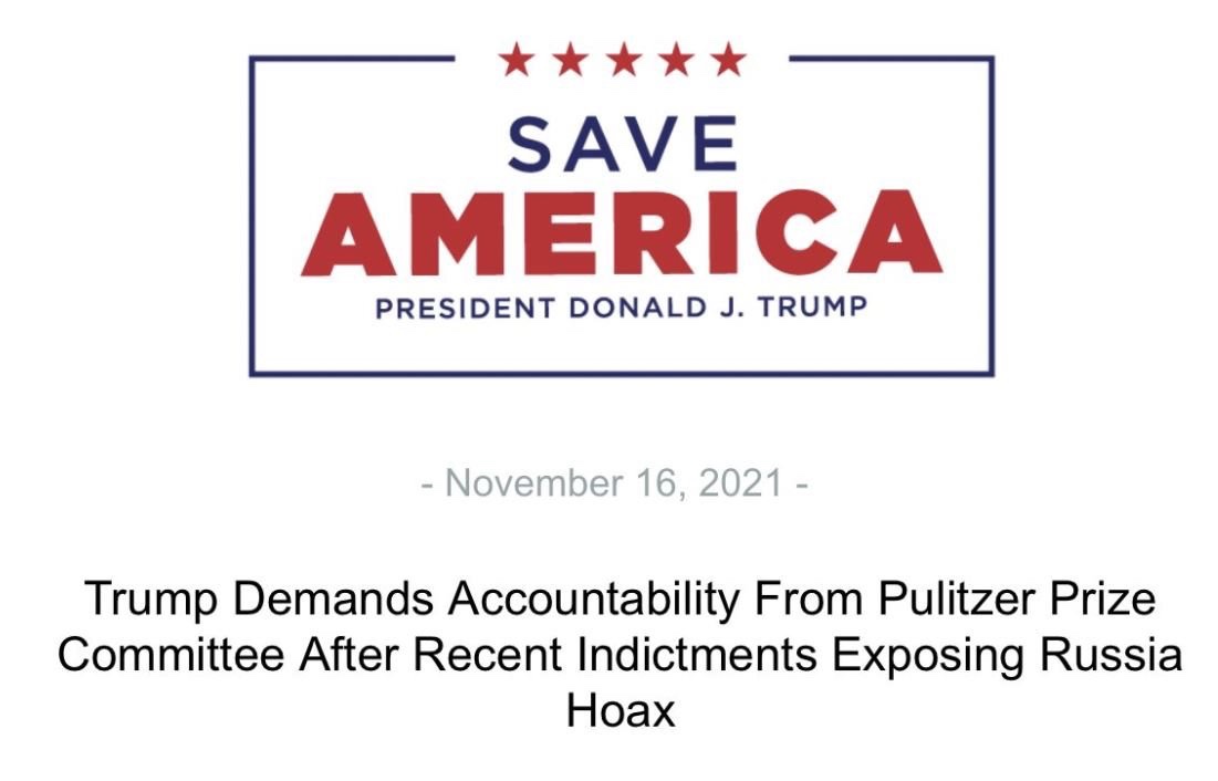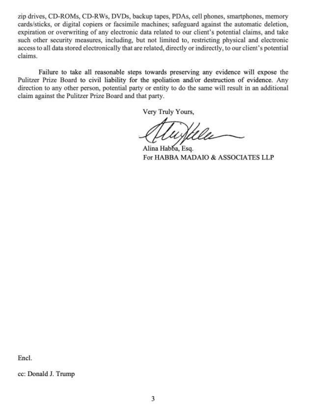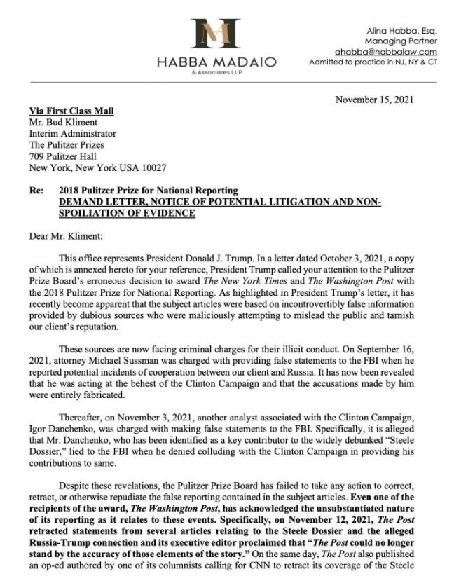La Organización Trump también exigió al Comité Pulitzer que corrigiera sus informes falsos que todavía se publican en su sitio web.