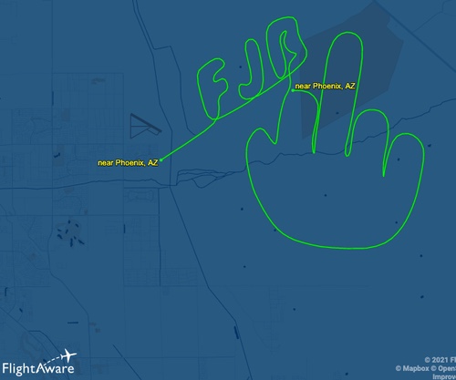 El piloto estaba a una altitud de 2.500 a 3.500 pies cerca de Pheonix, volando alrededor de 85-100 mph durante 37 minutos la semana pasada mientras creaban su obra maestra en el cielo. Aquí hay una reproducción del vuelo.