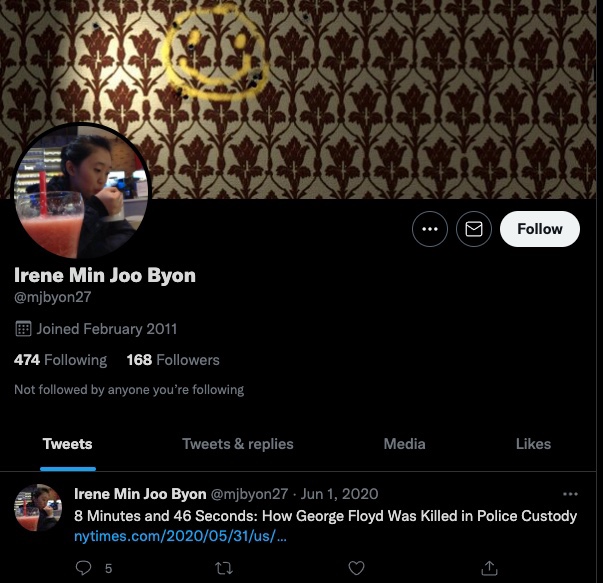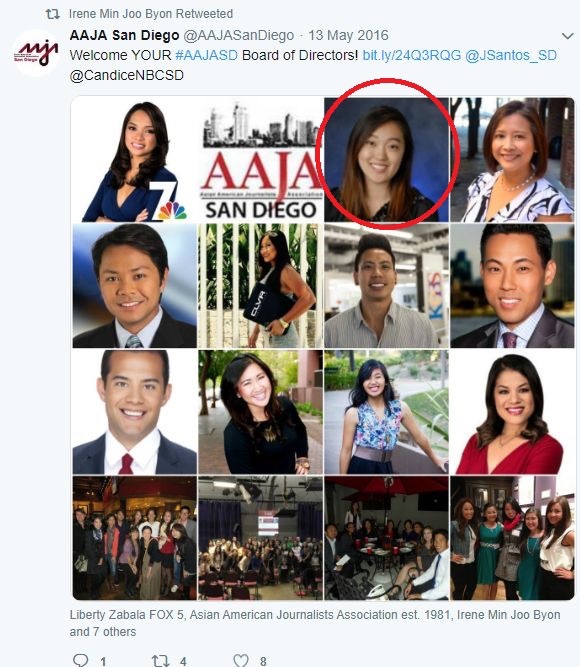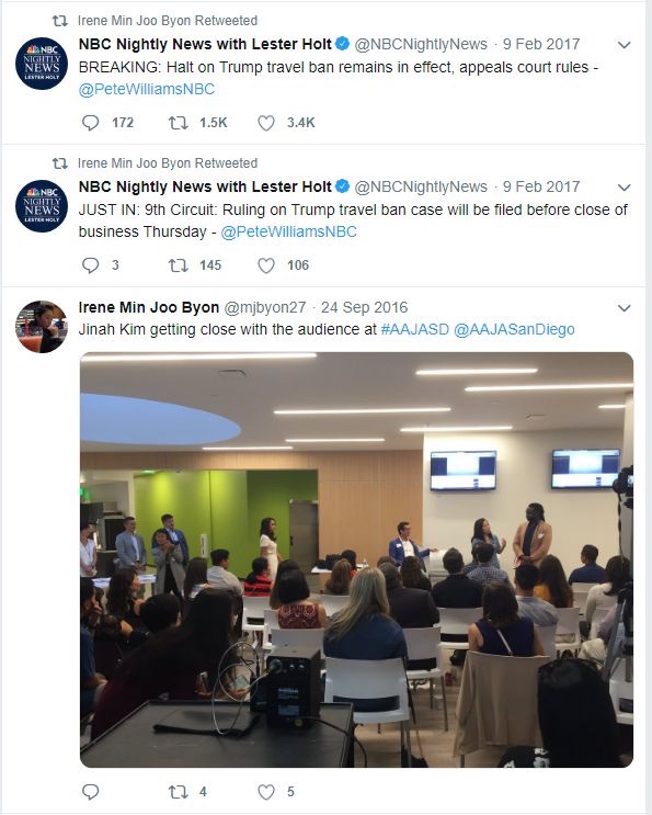 Irene Min Joo Byon también estaba interesada en la prohibición de viajar a Trump. Estuvo activa en la Asociación de Periodistas Asiático-Americanos en San Diego y fue asesorada por una reportera de ABC 10 llamada Virginia Cha.