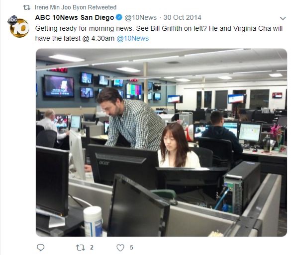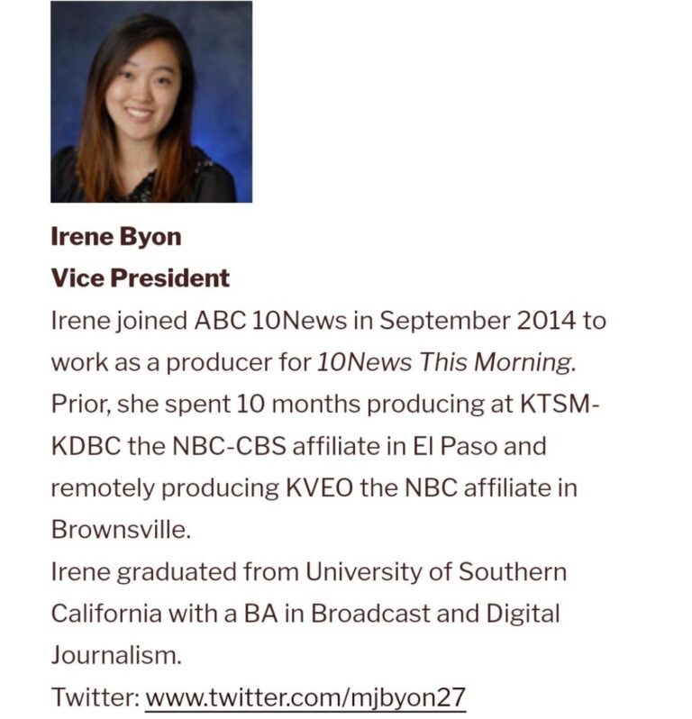 La breve biografía de Irene Byon se puede ver a continuación. Dice que «se unió a ABC10 News en septiembre de 2014 para trabajar como productora de 10News This Morning. Antes, pasó 10 meses produciendo en KTSM-KDBC la afiliada NBC-CBS en El Paso y produciendo de forma remota KVEO, la filial de NBC en Brownsville».