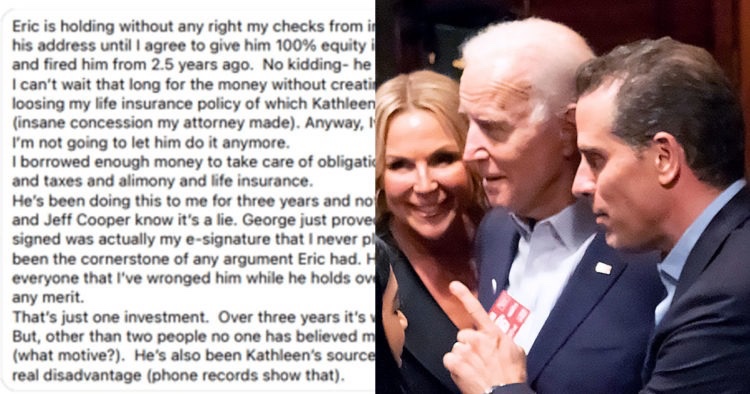 Al día siguiente, Hunter envió un mensaje de texto a su padre Biden sobre una diatriba sobre una disputa comercial que estaba teniendo con el mencionado Eric, diciéndole a Joe que Eric está «manteniendo sin ningún derecho mis cheques de inversiones que de alguna manera fueron a su dirección hasta que acepto darle el 100% de capital en un negocio del que poseo el 100%.