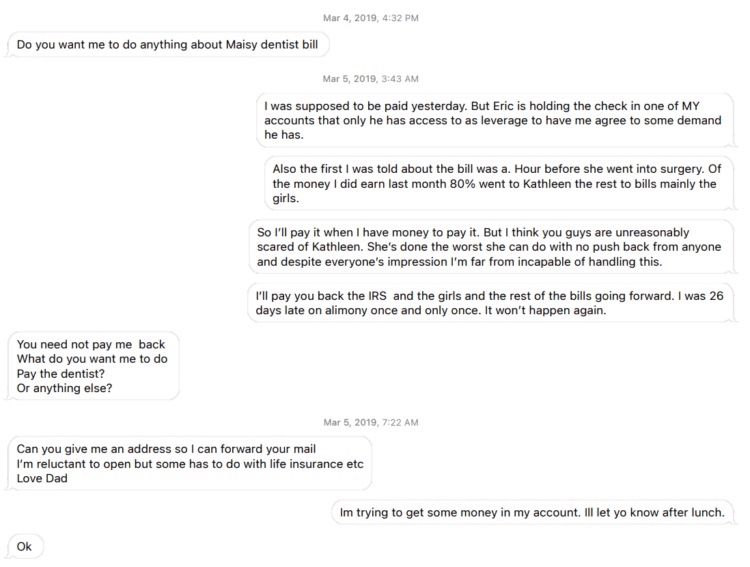 En una conversación de texto entre Hunter Biden y su padre Joe del 5 de marzo de 2019, Hunter se lamentó a Joe de que «se suponía que se le pagara ayer», pero que «Eric está manteniendo el cheque en una de MIS cuentas a las que solo él tiene acceso como palanca para que esté de acuerdo con alguna demanda que tiene».