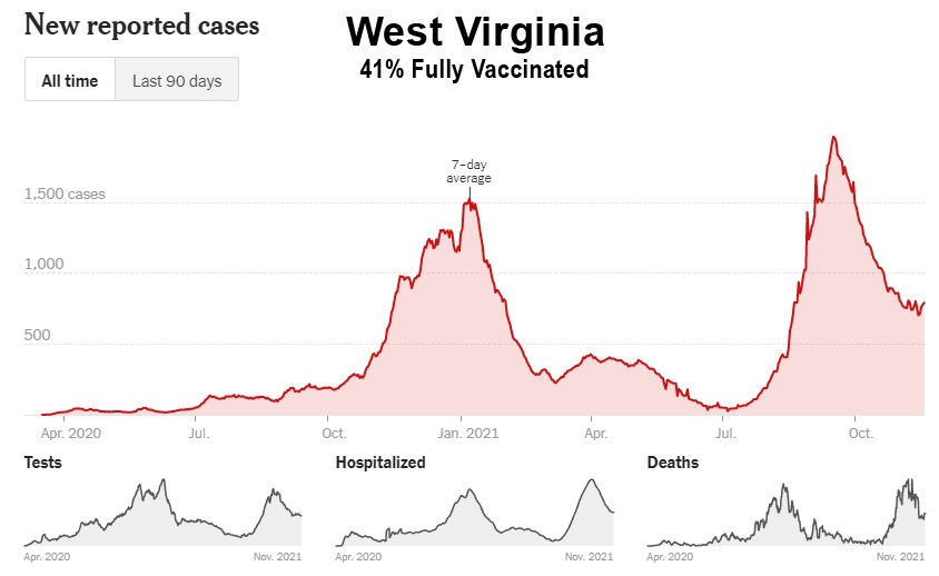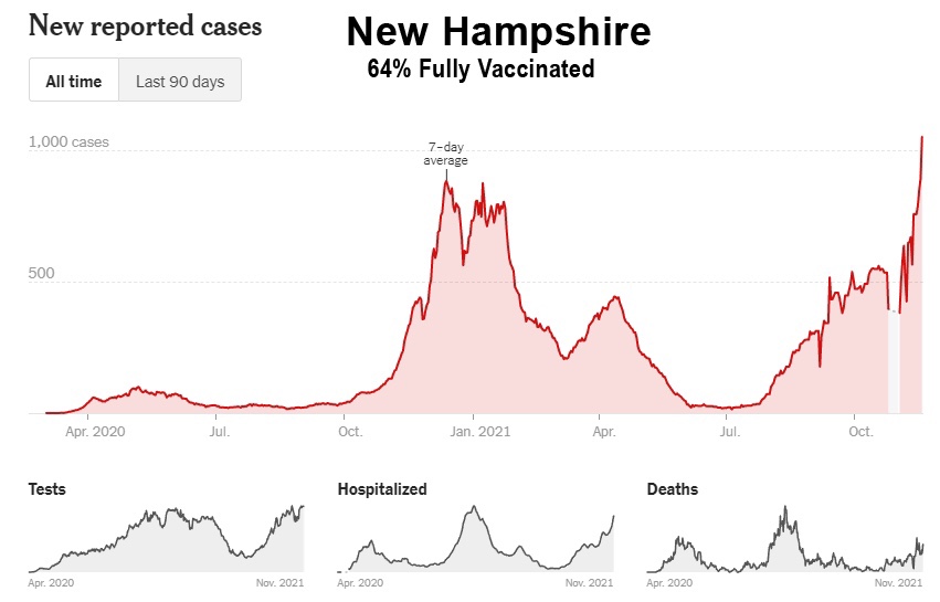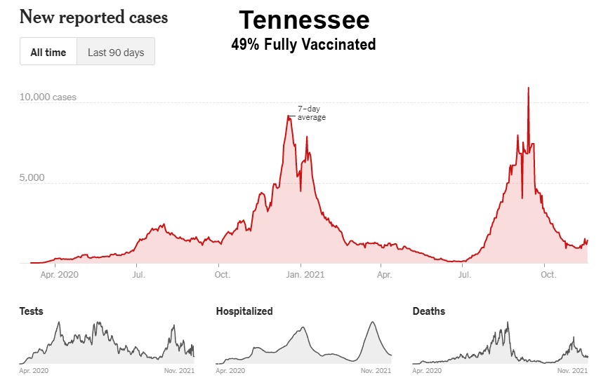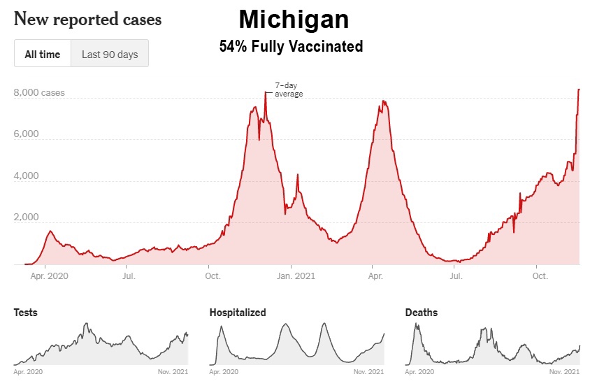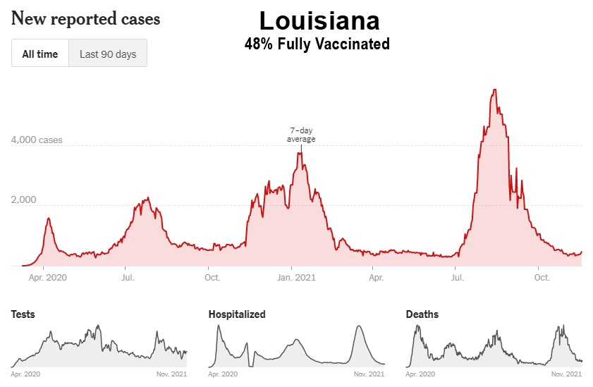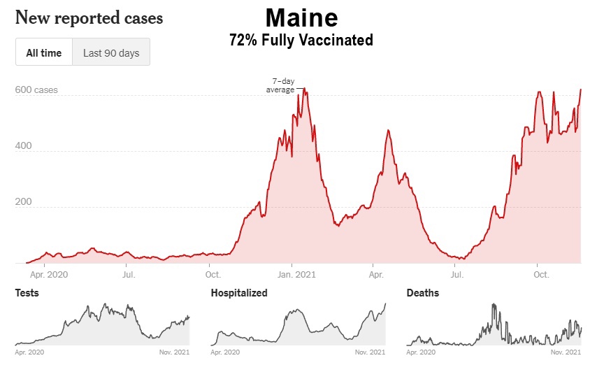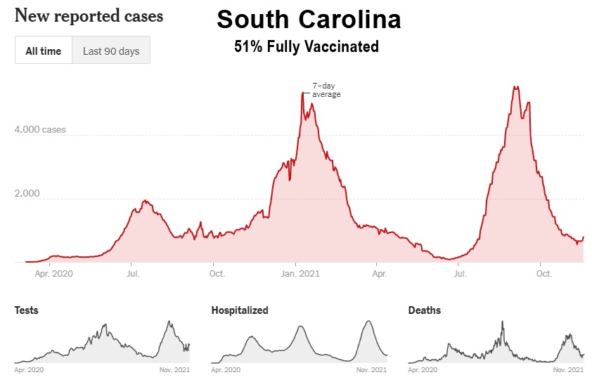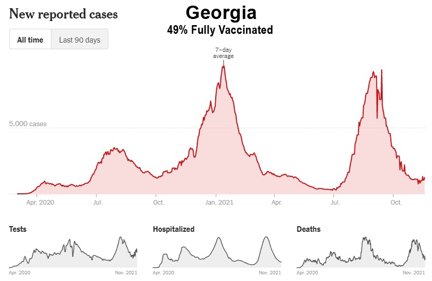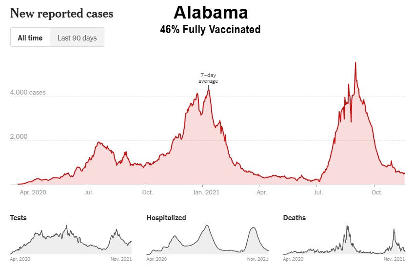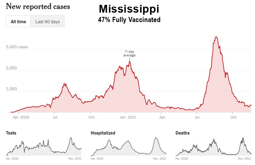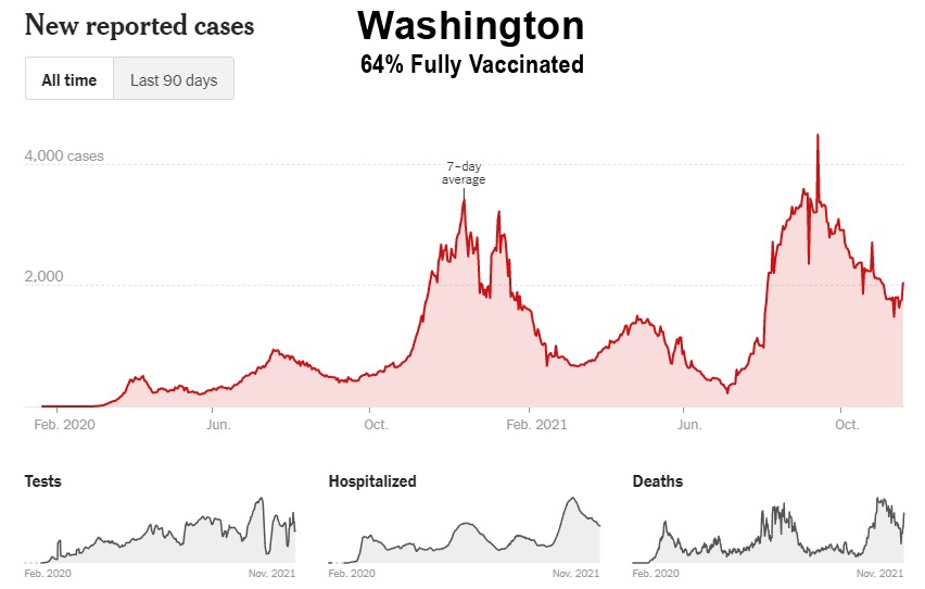 Como muestran estos datos, a pesar de la campaña de vacunación masiva, Florida, Georgia, Alabama, Carolina del Sur, Tennessee, Luisiana, Mississippi y Kentucky han experimentado sus niveles más altos de casos hasta ahora entre los meses de julio y octubre de 2021. Además, incluso Washington y Oregón, en el noroeste del Pacífico, tuvieron sus peores meses hasta ahora, y ahora están entrando en invierno a niveles de casos cerca de sus máximos de 2020: