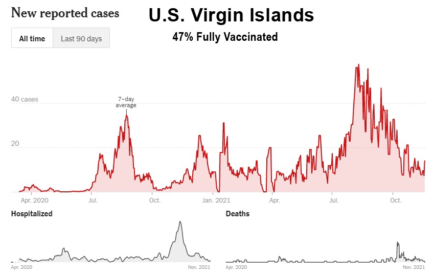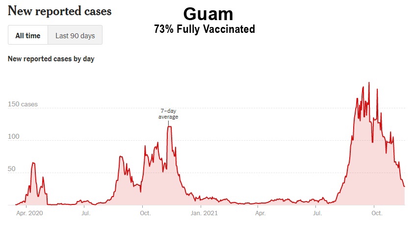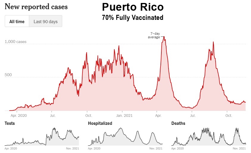 La campaña de vacunación incluso no ha logrado frenar la propagación en las islas de Hawái, Puerto Rico, Guam y los Estados Unidos. Islas Vírgenes, que vieron brotes récord después de la vacunación masiva: