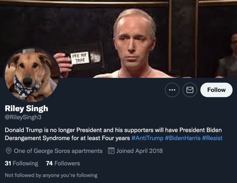 La cuenta de Twitter @RileySingh3 tiene una extensa historia de publicación de mensajes abusivos a usuarios conservadores. La cuenta parece diseñada exclusivamente para atacar a los conservadores: