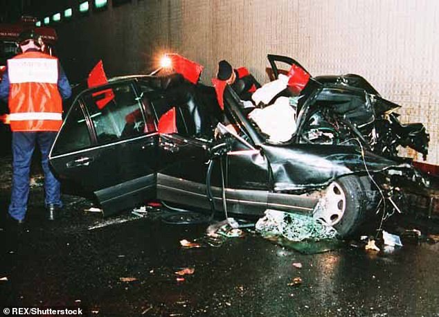 El ex miembro del equipo de seguridad de Al-Fayed estaba en el asiento del pasajero delantero del coche y quedó atrapado en los restos (en la foto), consciente pero con un trauma facial grave.
