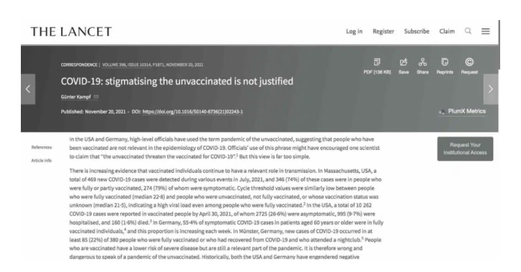 El 20 de noviembre, la prestigiosa revista médica The Lancet publicó un artículo del profesor Günter Kampf, de la Universidad de Medicina de Greifswald, en Alemania, en el que expone que cada vez hay más pruebas de que los individuos vacunados siguen teniendo un papel relevante en la transmisión, por lo que es demasiado simplista referirse a la crisis del Covid-19 como la “pandemia de los no vacunados”, como lo hacen funcionarios de alto nivel en diferentes países del mundo.