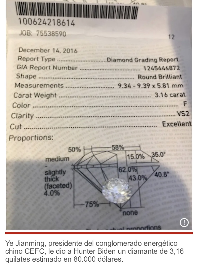Sellaron la nueva alianza con un rico regalo: un diamante de 3,16 quilates por valor de 80.000 dólares. Las fotografías de la impresionante piedra aparecen en la computadora portátil de Hunter junto con un informe de calificación que la enumera como un «brillante redondo» de Grado F con claridad «VS2» principal y corte «excelente».