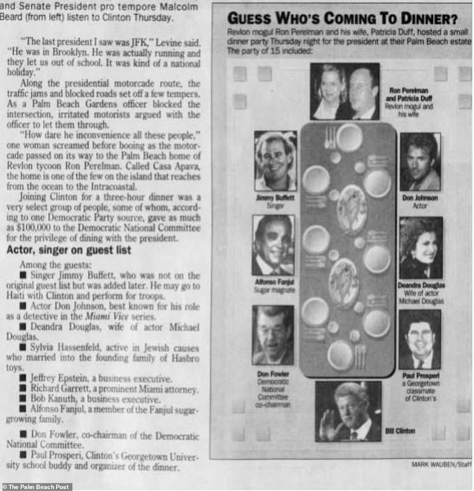 Los dos hombres comenzaron a socializar fuera de la Casa Blanca y dos meses después, el 30 de marzo, Epstein pagó hasta 100.000 dólares para asistir a una recaudación de fondos demócrata en Palm Beach, donde Clinton estaba presente.