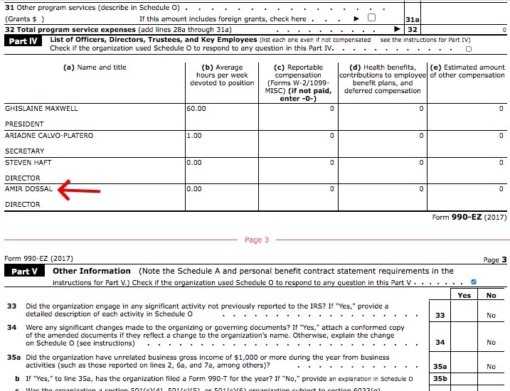 El esfuerzo filantrópico conservacionista oceánico de la socialité británica finalmente nunca se materializó, dicen los informes. Sin embargo, según las organizacionesIRS Form 990-EZ para el año fiscal que terminó en diciembre de 2017, Dossal fue incluida como directora del proyecto junto con ella.