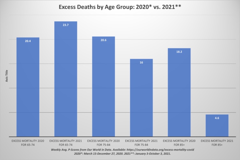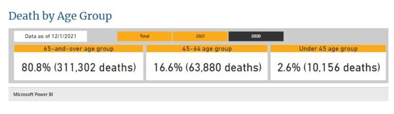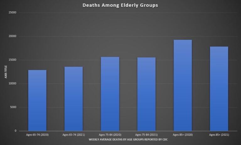 A pesar de que más del 99% de la población anciana se reporta «vacunada» y el 87% se reporta como «completamente vacunada», la población anciana en los Estados Unidos ha estado muriendo a casi el mismo ritmo que la etapa previa a la vacunación de la pandemia. De hecho, la población anciana de 65 a 74 años ha estado muriendo a un ritmo más alto.