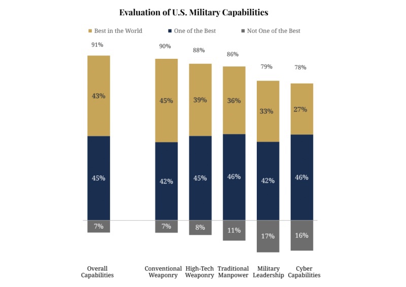 Una nueva encuesta nacional patrocinada por la Fundación Presidencial Ronald Reagan (RRPFI) sobre las prioridades y opiniones de los estadounidenses en cuestiones de defensa, militares y política exterior ha encontrado una «fuerte disminución de la confianza en los EE. UU. Militar» y una «creciente ambivalencia sobre el liderazgo estadounidense en el mundo;
