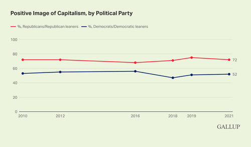 La mayoría de republicanos y demócratas tienen opiniones positivas sobre el capitalismo, pero los republicanos lo califican más alto. Mientras que aproximadamente siete de cada 10 republicanos y republicanos se inclinan han visto el capitalismo positivamente desde 2010, aproximadamente la mitad de los demócratas lo han hecho. Este año, el 72 % de los republicanos y el 52 % de los demócratas tienen una imagen positiva del capitalismo.