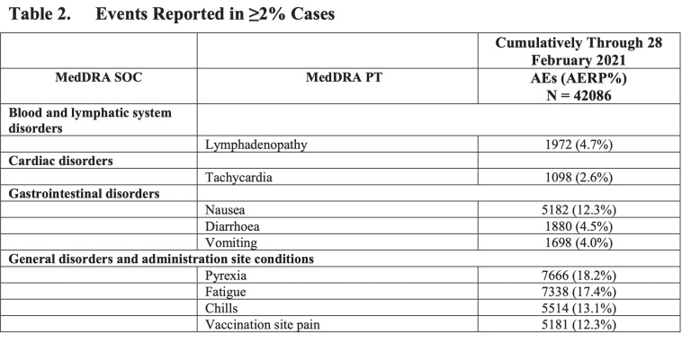 Este documento proporciona un análisis integrado de los datos acumulativos de seguridad posteriores a la autorización, incluidos los informes de eventos adversos posteriores a la autorización en EE. UU. y en el extranjero recibidos hasta el 28 de febrero de 2021.