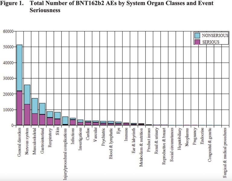 Como se muestra en la Figura 1 [ver más abajo], las Clases de Órganos del Sistema (SOC) que contenían el mayor número (≥2%) de eventos, en el conjunto de datos generales, fueron trastornos generales y condiciones en el lugar de administración (51.335 AA), trastornos del sistema nervioso (25.957), trastornos musculoesqueléticos y del tejido conjuntivo (17.283), trastornos gastrointestinales (14.096), trastornos de la piel y del tejido subcutáneo (8.476), trastornos respiratorios, torácicos y mediastínicos (8.848), infecciones e infestaciones (4.610), lesiones, intoxicaciones y complicaciones del procedimiento (5.590) e Investigaciones (3.693